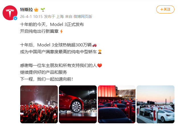 凤凰网科技讯 4月1日,特斯拉官方微博发布Model 3发布十周年纪念内容。截至目前,Model 3全球累计销量已超300万辆,并获评中国用户满意度最高的纯电中型轿车。