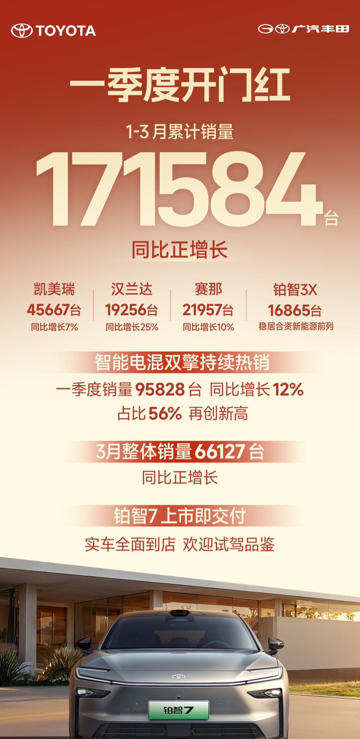 IT之家 4 月 1 日消息,广汽丰田今日官宣,一季度销量 171584 辆,3 月销量 66127 辆,月度季度双双同比正增长。IT之家附各车型销量: