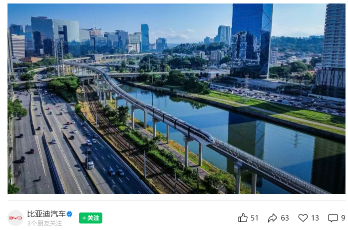 IT之家 4 月 1 日消息,比亚迪今日宣布,其首个海外轨道交通项目 —— 巴西圣保罗 17 号黄金线云轨于当地时间 3 月 31 日正式通车运营。