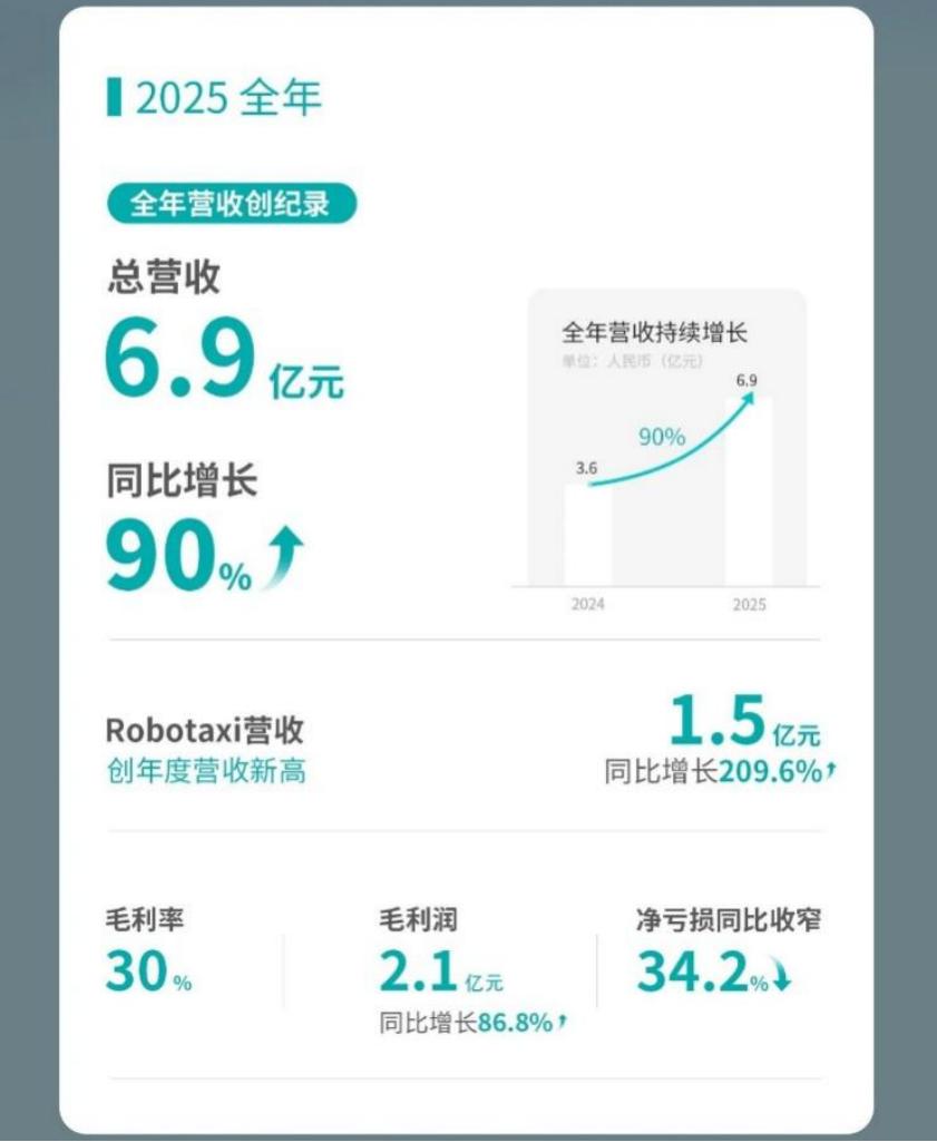 数据显示,2025年小马智行实现总营收6.29亿元,同比增长20%; Robotaxi业务收入达到1.16亿元,同比激增128.6%;乘客车费收入全年增幅接近400%。
