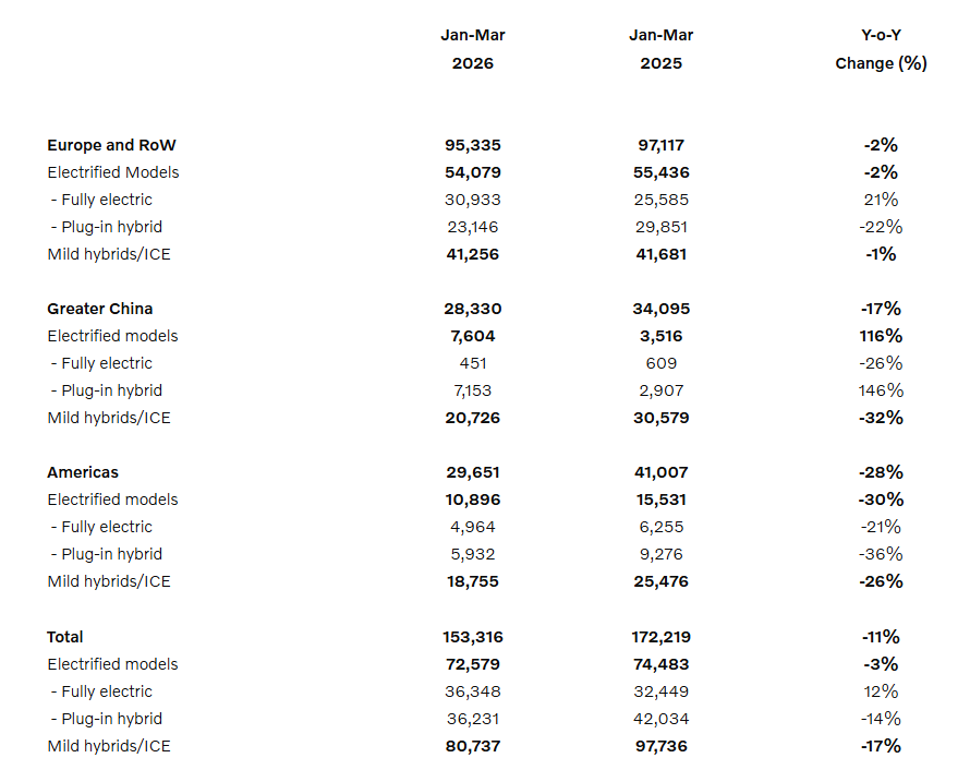 IT之家 4 月 2 日消息,沃尔沃汽车今日发布了 2026 年第一季度销量报告: