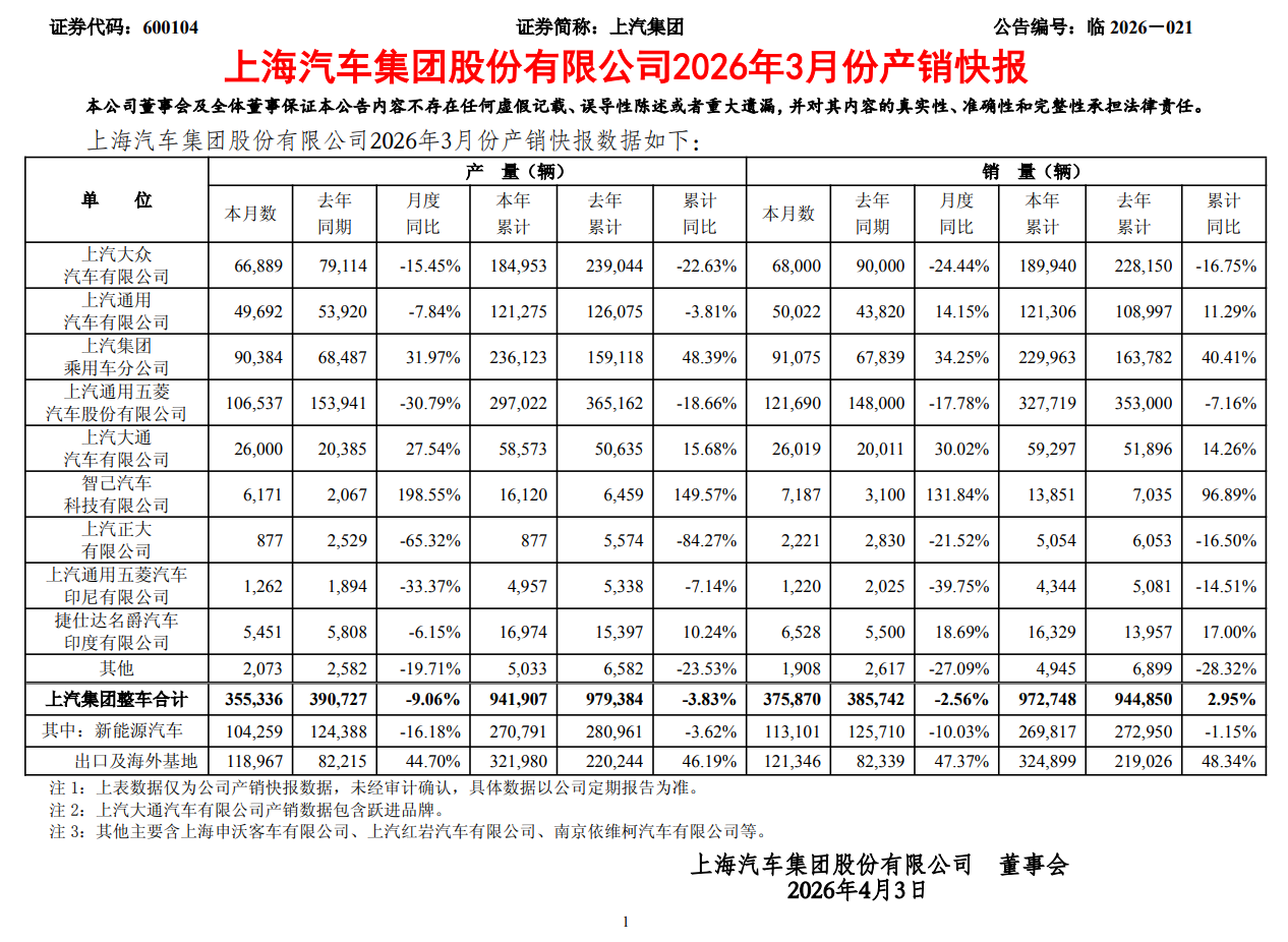 IT之家 4 月 2 日消息,上汽集团今日发布了 2026 年 3 月产销快报: