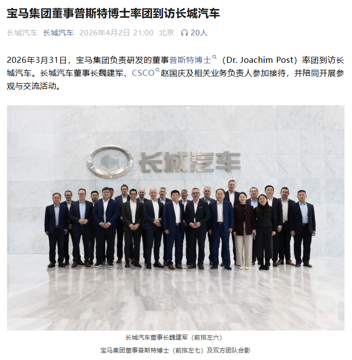 IT之家 4 月 3 日消息,据长城汽车官方,2026 年 3 月 31 日,宝马集团负责研发的董事普斯特博士(Dr. Joachim Post)率团到访长城汽车。长城汽车董事长魏建军、CSCO 赵国庆及相关业务负责人参加接待,并陪同开展参观与交流活动。