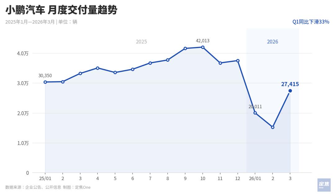 小鹏今年开局遇冷,新车型P7+和G7在一月初上市,并靠现金补贴刺激订单,但销量的拉动效果有限。尽管3月环比大幅增长80%,Q1实际交付量6.27万台,在公司指引范围(6.1万至6.6万台)内,但季度同比(2025年Q1为9.40万辆)下滑33%。