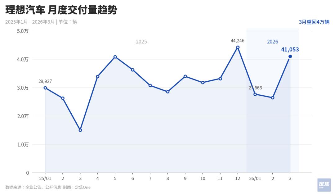 在3月这个季度末的冲量月,最能反映出竞争激烈程度的,依然是新势力车企。零跑以50029辆稳居榜首;理想重回4万辆(41053辆),同比增速(173%)在六家中最高,时隔两年首次超过季度指引上限;蔚来(35486辆)跻身第三,同比涨幅(136%)仅次于理想;小鹏(27415辆)单月和季度都在下滑;问界按照赛力斯汽车口径,销量约为20234辆;小米超20000辆,和上月基本持平。