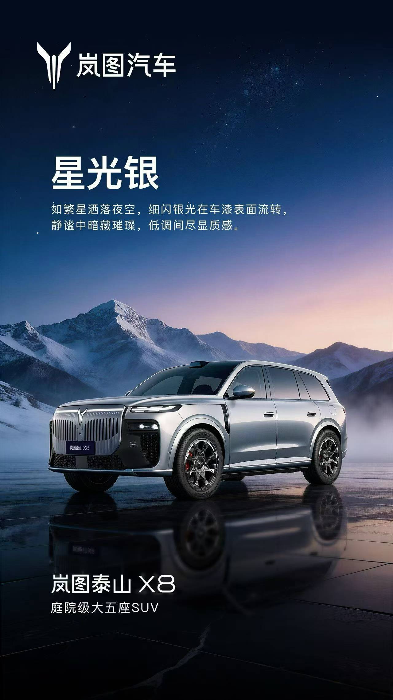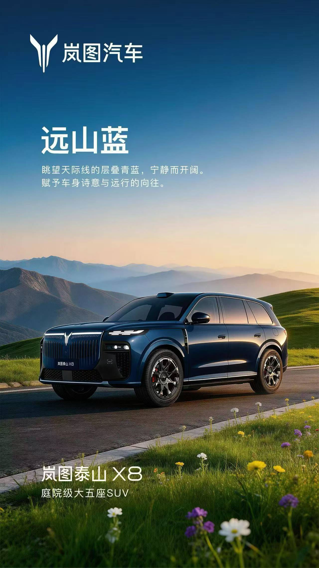 IT之家 4 月 6 日消息,今天(4 月 6 日)上午,岚图汽车公布了岚图泰山 X8 六款车色:玄英黑、杜若白、宸星灰、星光银、碧玺红、远山蓝。据悉,泰山 X8 预计将于 2026 年上半年正式上市。