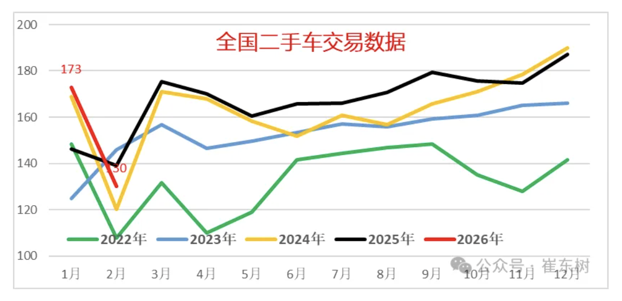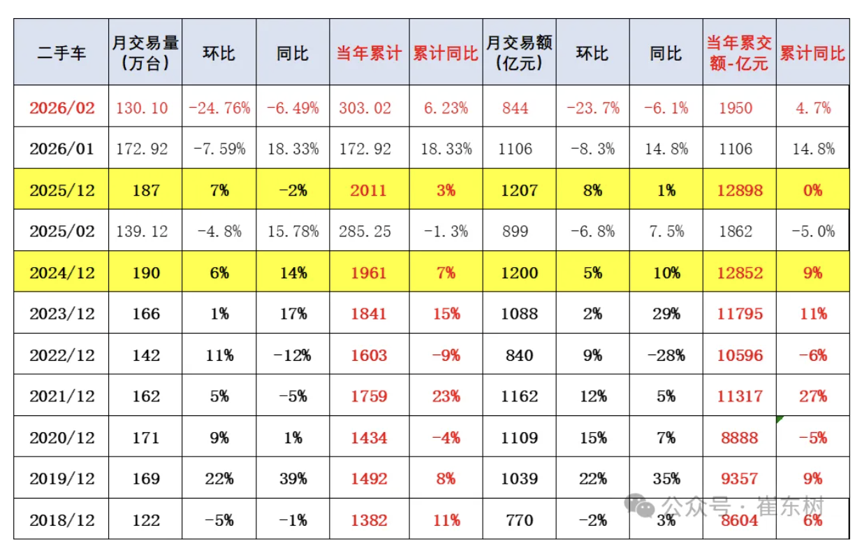 IT之家 4 月 6 日消息,乘联分会崔东树昨天公布了 2026 年 2 月全国二手车市场行情,2 月全国二手车市场交易量 130.1 万台,环比降 25%,同比降 6.5%,交易金额为 884 亿元,同比降 6%。