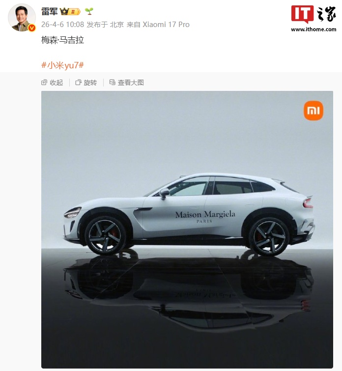 IT之家 4 月 6 日消息,小米创办人、董事长兼 CEO 雷军今日晒出了小米 YU7 梅森 · 马吉拉涂装版的外观。画面显示,该车采用专属极简白涂装 + 品牌标识设计。