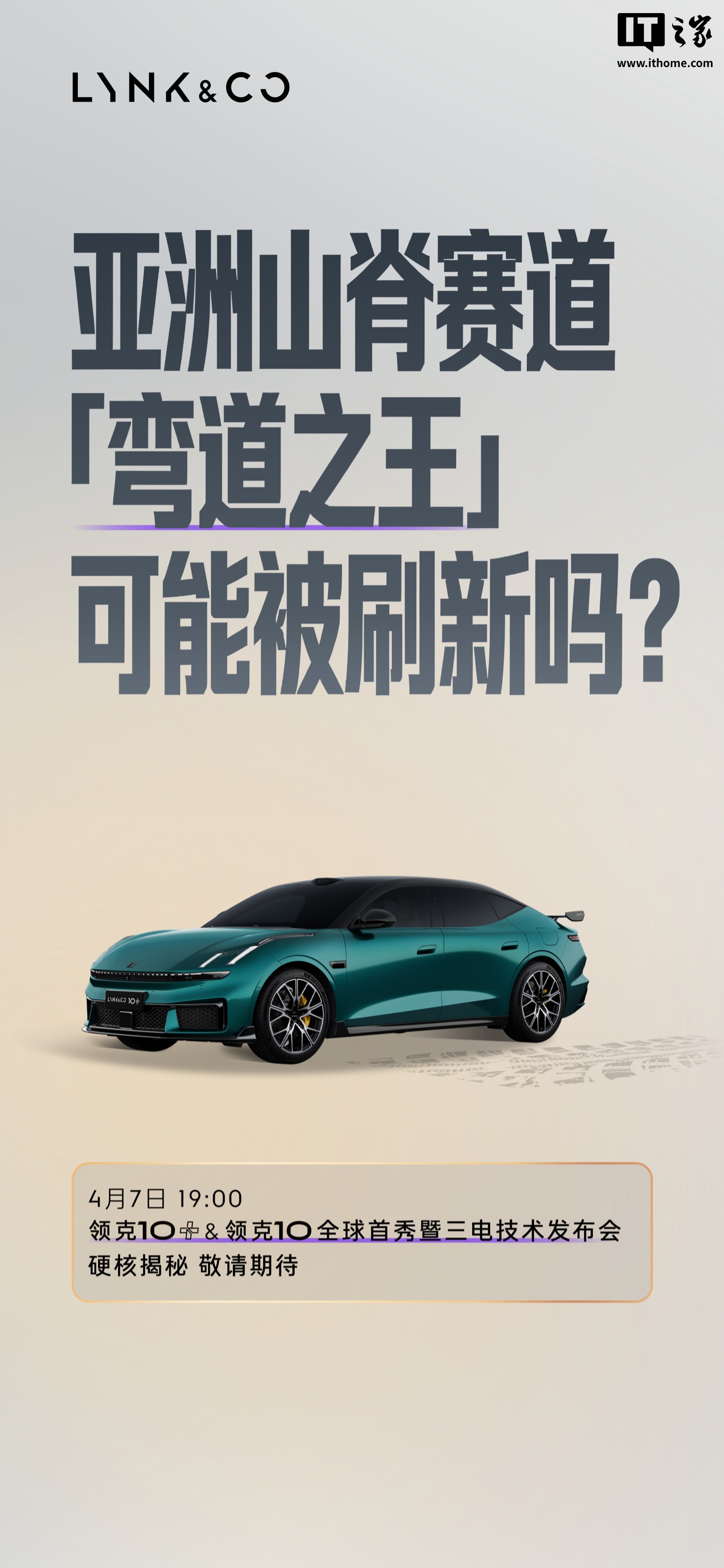 IT之家 4 月 6 日消息,领克汽车官方今日宣布,领克 10+ & 领克 10 全球首秀暨三电技术发布会定档 4 月 7 日 19:00 举行,将解答电芯和电池能否硬扛「超纲」打击、连续 100 次急加减速电驱能否「顶住」、充电能否再快一些等问题。
