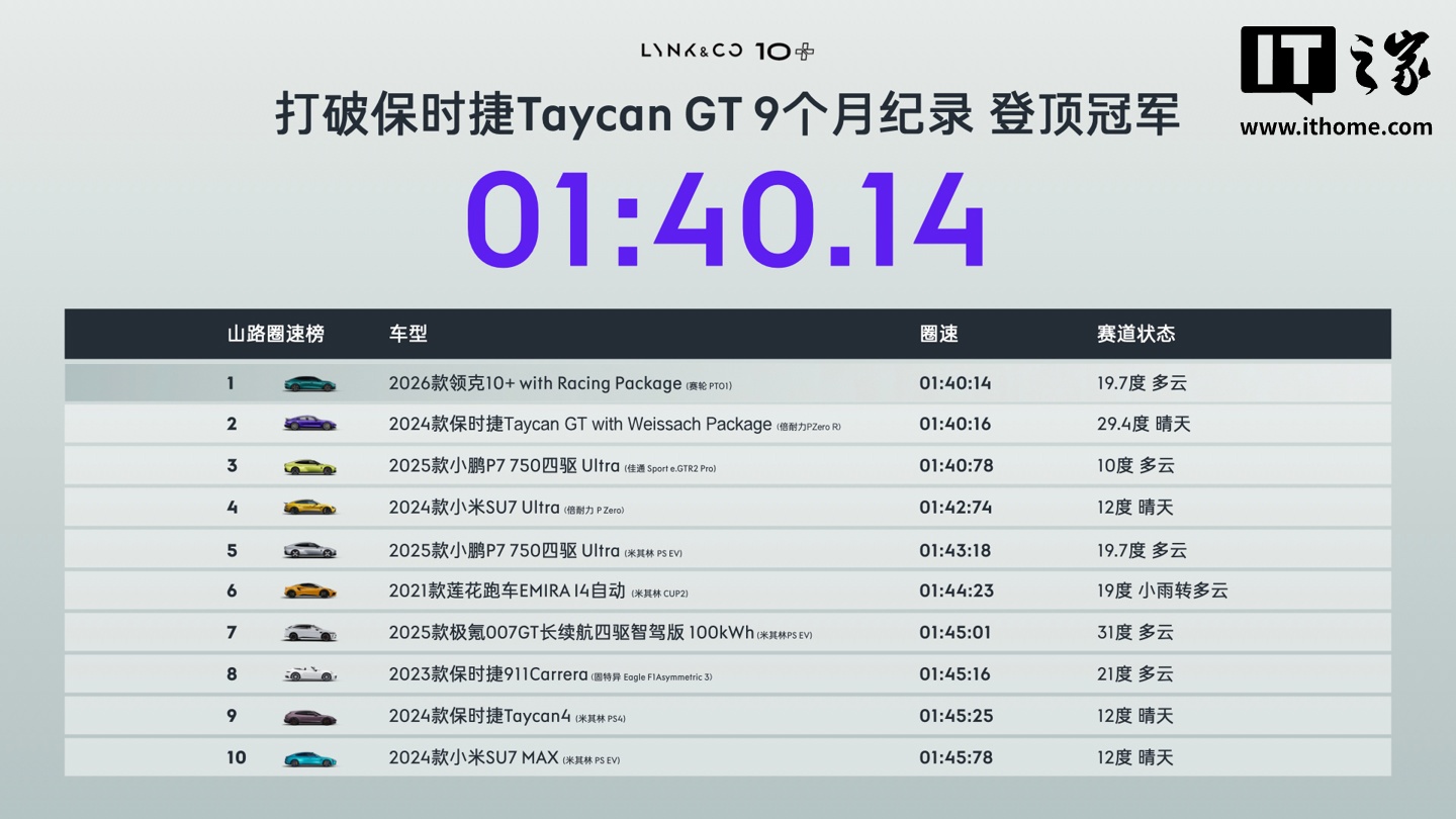 领克 10+ 汽车以 1 分 40 秒 14 成绩超越 Taycan GT,刷新亚洲山脊赛道圈速第一
