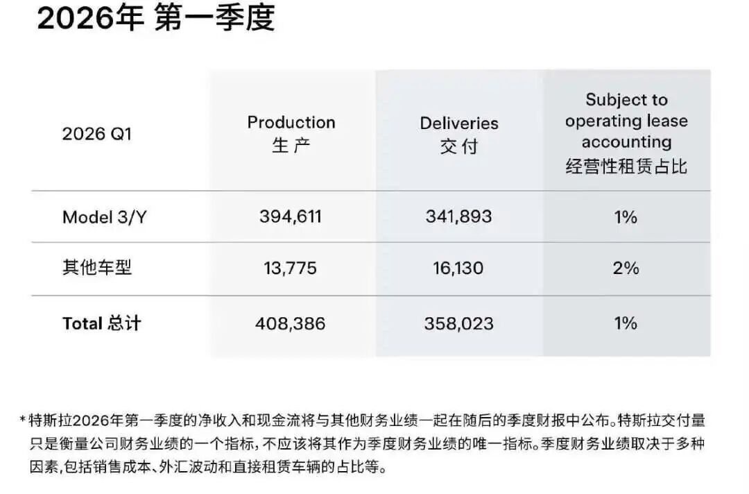 有意思的是,当市场开始用这些数据判断特斯拉“走弱”时,马斯克表示不服气,在X上转发了一组数据,对比了2026年一季度主要纯电车企的交付情况。