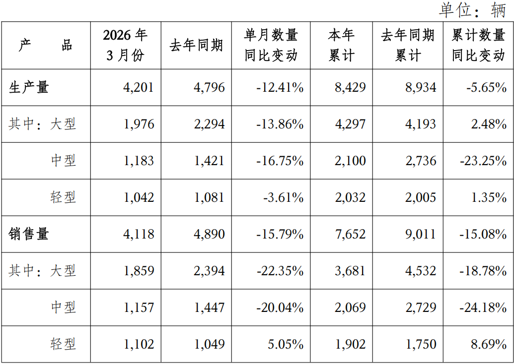 销量方面,2026年3月销售量为4,118辆,去年同期为4,890辆,同比下降15.79%;本年累计销售量为7,652辆,去年同期为9,011辆,同比下降15.08%。