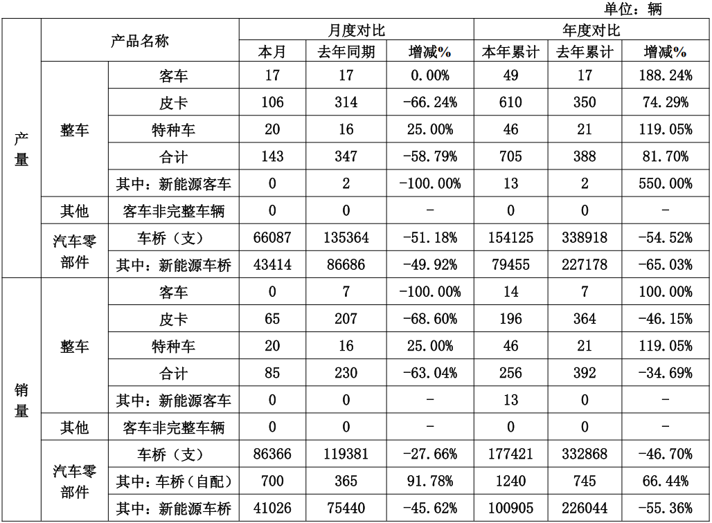 汽车零部件方面,车桥产品3月销量为86366支,去年同期为11,9381支,同比下降27.66%;本年累计销量为177421支,较去年同期的33,2868支下降46.7%。其中,新能源车桥3月销量为4,1026支,去年同期为75440支,同比下降45.62%;本年累计销量为100905支,较去年同期的226044支下降55.36%。