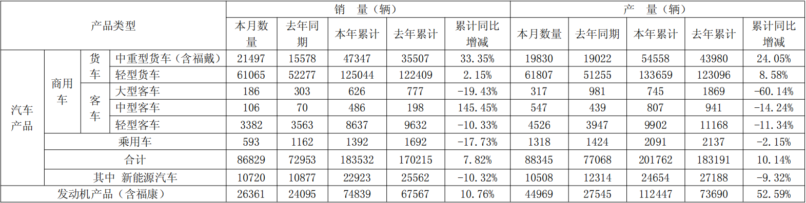 其中,中重型货车(含福戴)3月销量为21,497辆,去年同期为15,578辆;本年累计销量47,347辆,同比增长33.35%。3月产量为19,830辆,去年同期为19,022辆;本年累计产量54,558辆,同比增长24.05%。