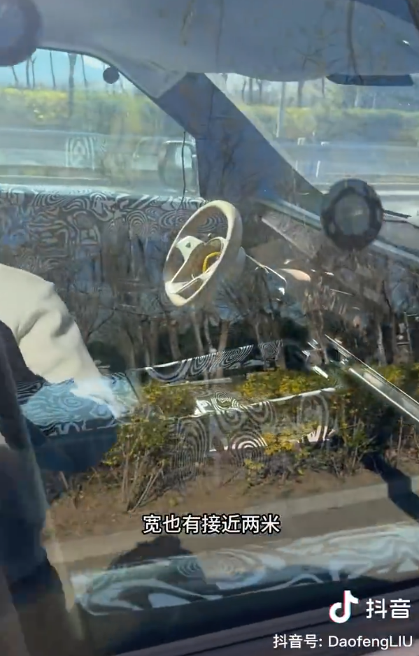 视频发布者描述称,该车目测车长约5.2米,车宽约2米。车辆将采用四轮独立悬挂,预计会提供增程和纯电两种动力版本,并可能配备空气悬架。内饰部分可见双联屏设计。此外,车辆前挡风玻璃顶部明显凸起的激光雷达组件引人注目。