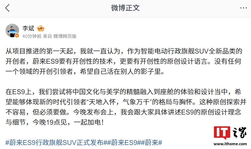 IT之家 4 月 9 日消息,蔚来创始人、董事长、CEO 李斌今日发文谈及了原创设计。他认为,作为智能电动行政旗舰 SUV 全新品类的开创者,蔚来 ES9 要有开创性的技术。