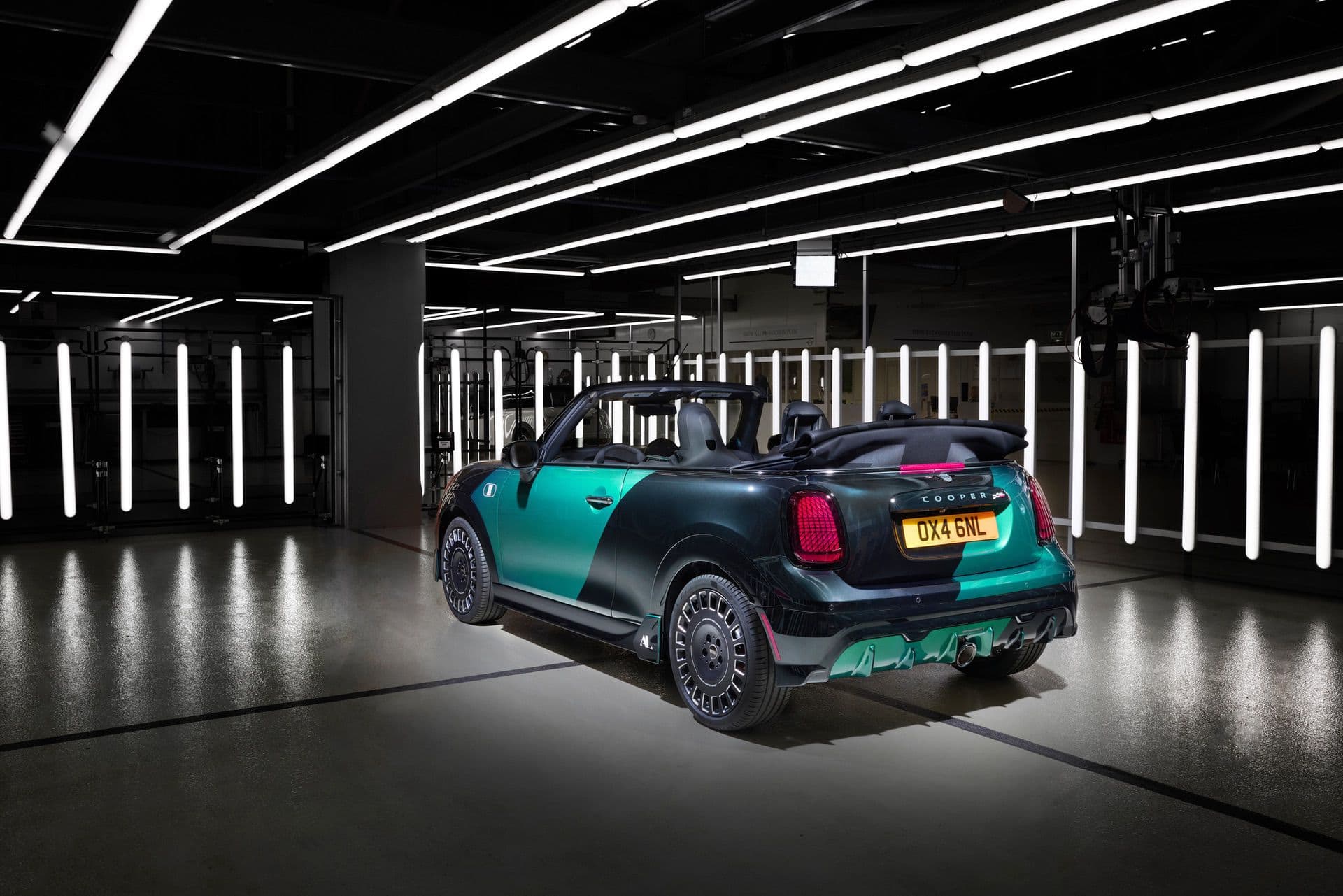 外观方面,整车采用午夜黑与特调金属绿两种配色。不同于传统的车顶或腰线分色,这两种颜色沿对角线分割车身,且左右两侧呈镜像反转效果。该涂装在牛津工厂手工喷涂并完成清漆覆盖,为彰显其英国制造血统,软顶篷还配有同色系米字旗图案。