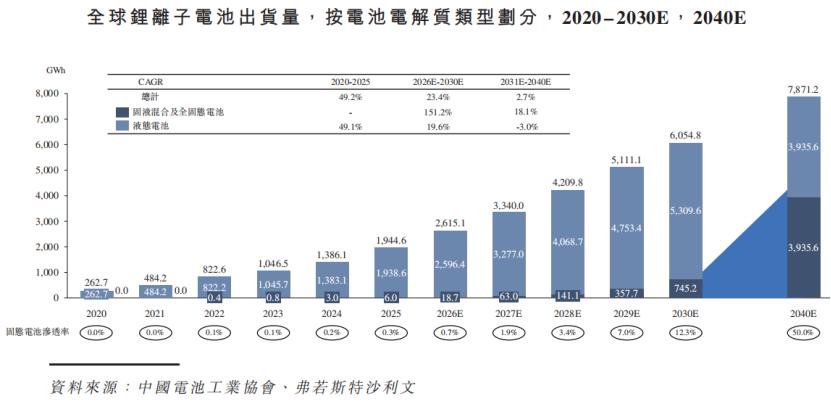 随后,随着商业化进程推进逐步进入规模化放量阶段,固液混合及全固态电池出货量预计将快速增至2030年的745.2GWh,其市场渗透率预计提升至约12.3%。