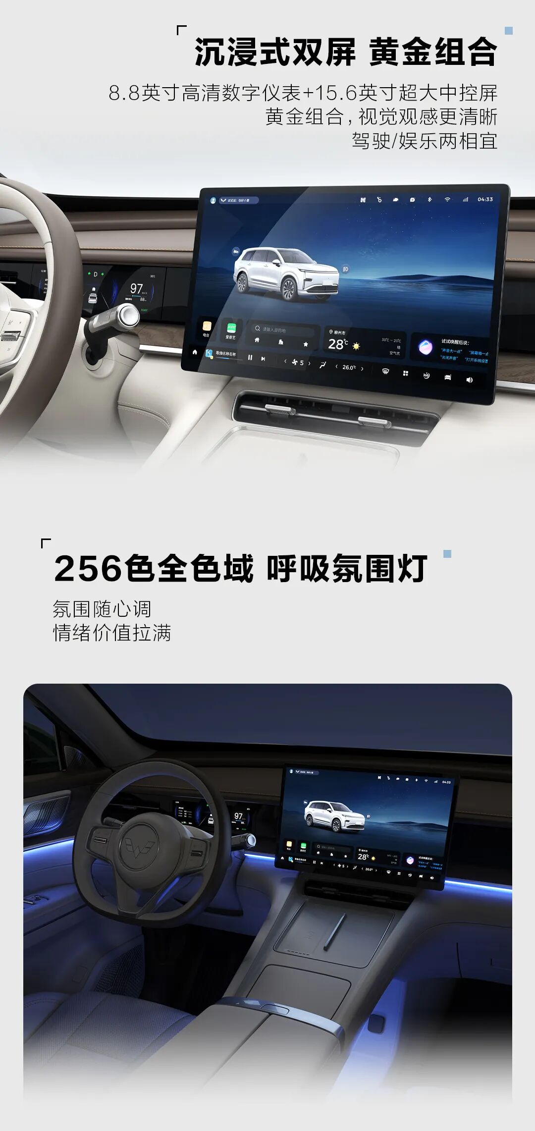 星光 L 整车搭载 8.8 英寸仪表屏 +15.6 英寸中控屏,配备 256 色全色域呼吸氛围灯,支持固定 / 随机 / 驾驶三种模式;还有副驾老板键,二排乘客可一键调节副驾;二排小桌板。
