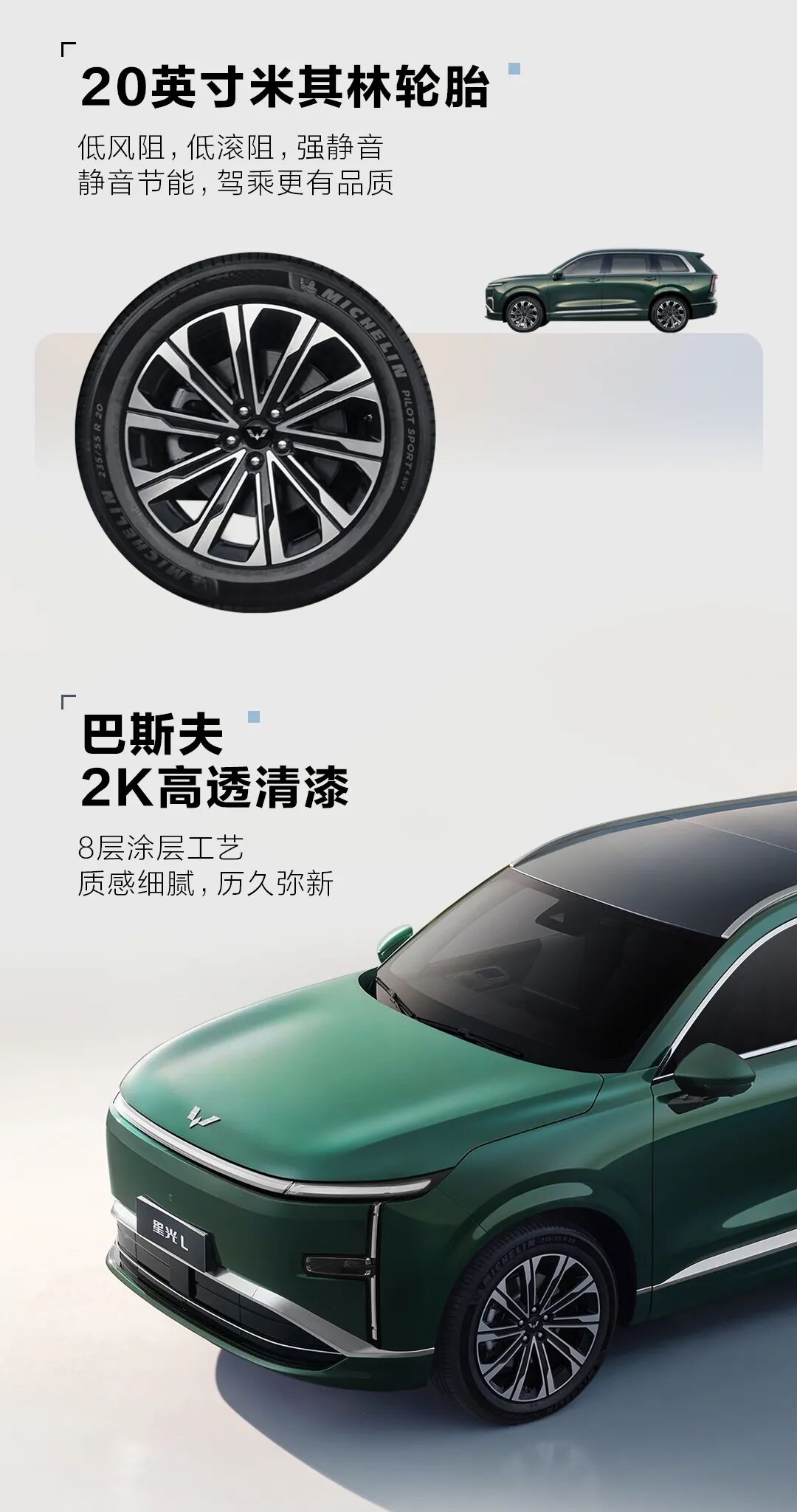 车漆方面,星光 L 采用巴斯夫 2K 高透清漆,经 8 层工艺加持,五款中式车色 —— 苍松绿、沁湖蓝、墨竹黑、山岩银、晨霜白。