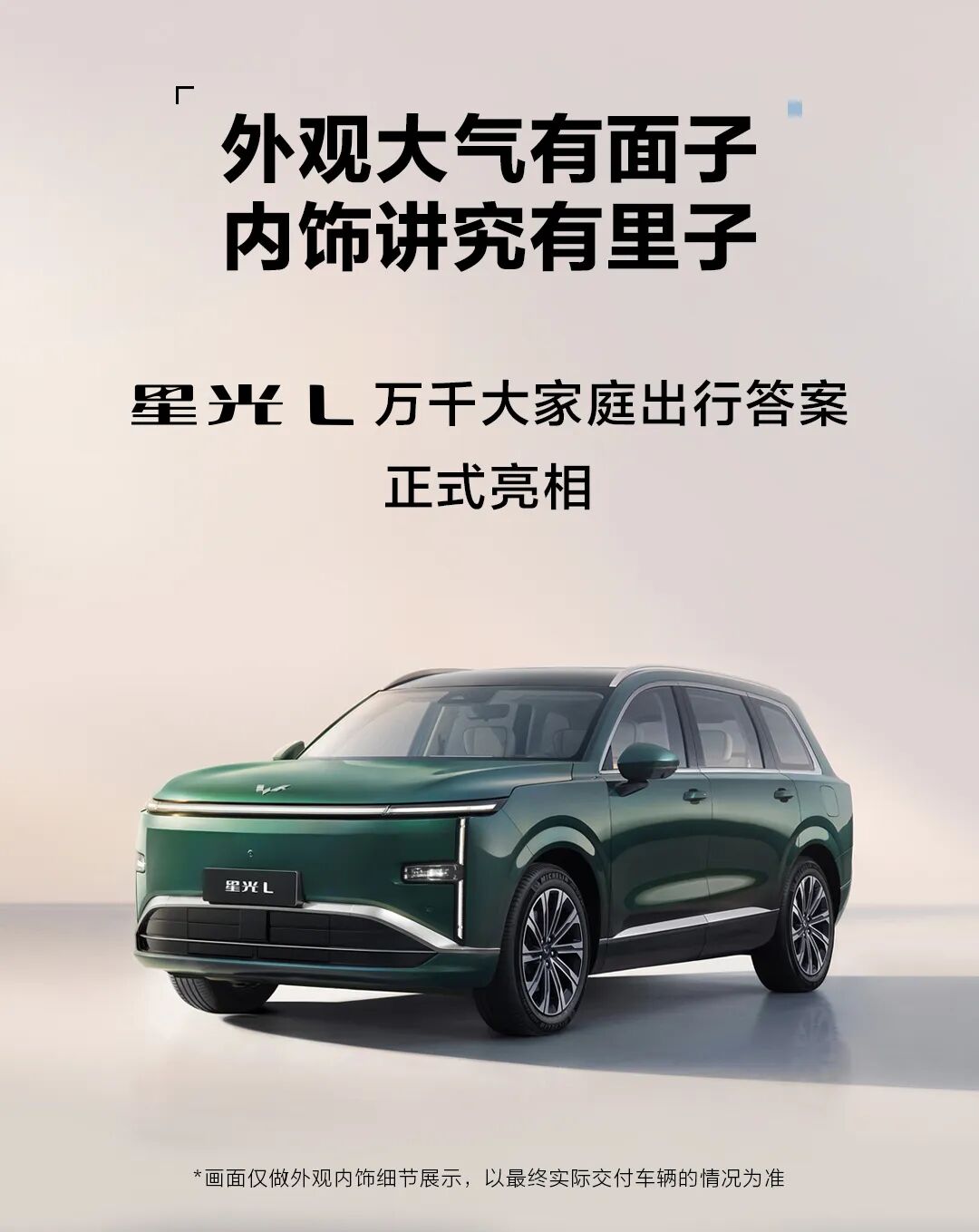 外观上,星光 L 采用中式美学设计语言,前脸主动进气隔栅配合车身侧面镀铬饰条,还有中式星门灯组与贯穿式尾灯,搭载 20 英寸米其林轮胎,前风挡下角配有柳州地标印花和尾部隐藏式后挡风雨刮。