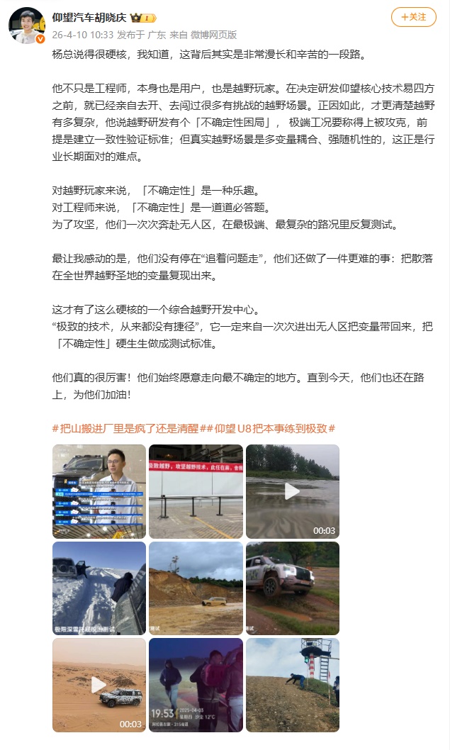 IT之家 4 月 10 日消息,此前在 3 月初,比亚迪发布了 2026 款仰望 U7 、U8 和 U8L 鼎世版车型,新车搭载第二代刀片电池及闪充技术。此后比亚迪仰望销售事业部总经理胡晓庆曾在微博发文宣布,仰望 U8L 四座版汽车将于 4 月 24 日北京车展正式亮相。而今天,胡晓庆继续发文分享全新仰望 U8 系列背后的细节,在微博中,胡晓庆主要谈到了仰望挑战越野技术背后的一些故事,感叹越野的不确定性。