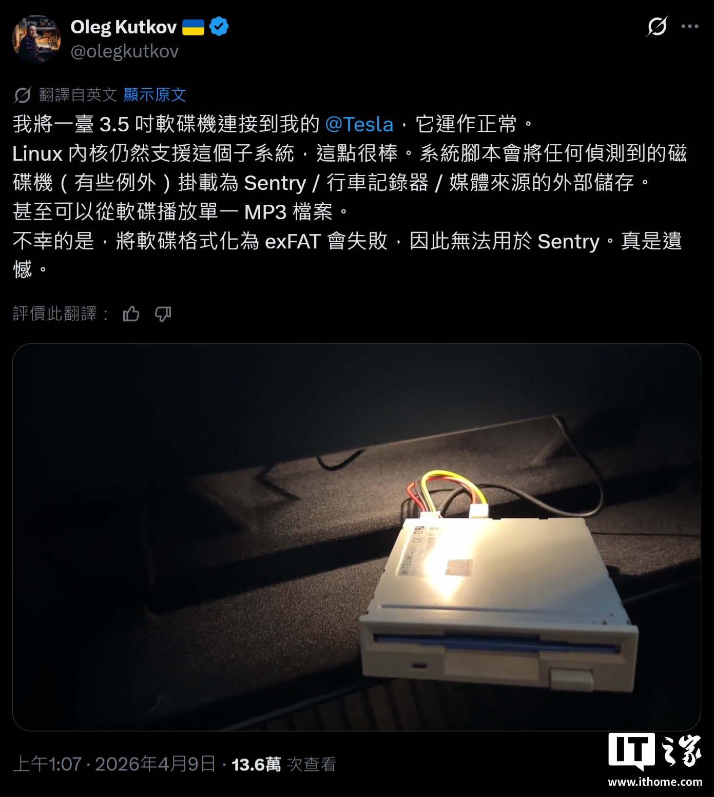 IT之家 4 月 11 日消息,乌克兰硬件工程师 Oleg Kutkov 前天在 X 平台发文称,他成功为一台特斯拉汽车加装 3.5 英寸软盘驱动器,甚至还能播放 MP3 音乐。