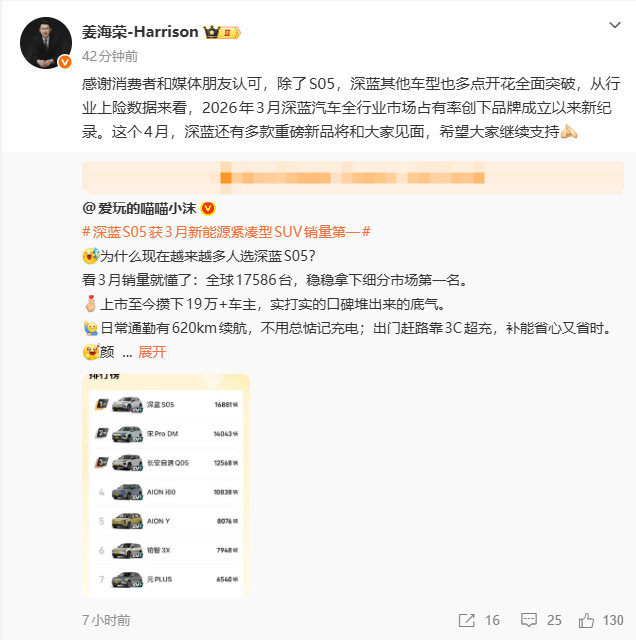IT之家 4 月 11 日消息,今天晚间,深蓝汽车 CEO 姜海荣在微博转发了一则深蓝 S05 获 3 月新能源紧凑型 SUV 销量第一的新闻消息,并配文表示:除了 S05,深蓝其他车型也多点开花全面突破,从行业上险数据来看,2026 年 3 月深蓝汽车全行业市场占有率创下品牌成立以来新纪录。