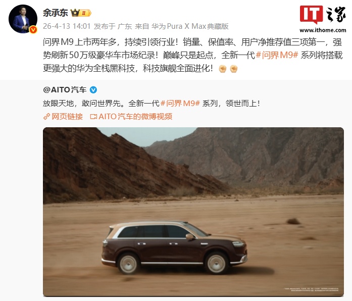 IT之家注意到,华为常务董事、产品投资评审委员会主任、终端 BG 董事长余承东今日放出预告,宣布全新一代问界 M9 系列将搭载更强大的华为全栈黑科技。