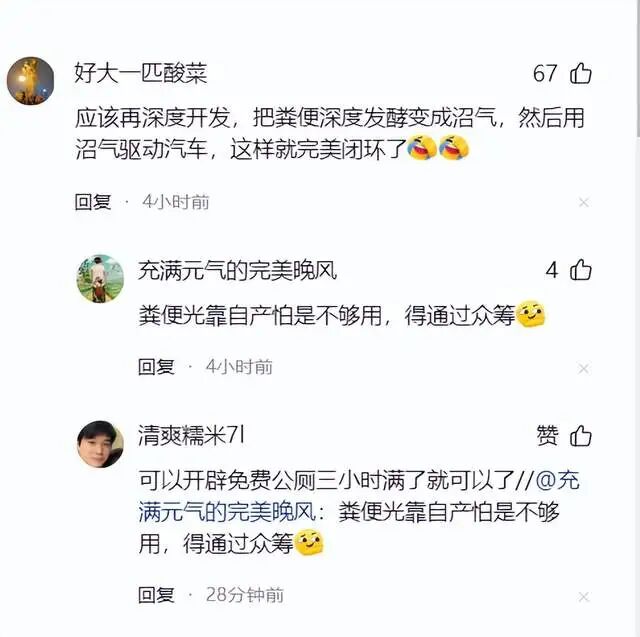 有网友建议在座椅下方的车底开一个排泄口,仿照老式火车的直排设计,就能从根源上解决异味问题,更有网友脑洞大开,建议深度开发变成沼气,用沼气驱动汽车。