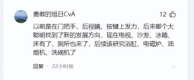 消息一出来的时候,评论区画风可以预见地跑偏了,一片欢乐气氛。什么“下一步该研究浴缸、电磁炉、油烟机了”、“一个人拉,一车人闻。”、“终于可以实现坐在车上拉”、“领先欧美二十年”之类的段子满天飞。