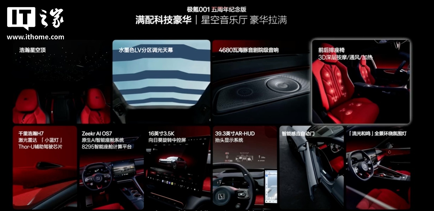 科技配置上,极氪 001 五周年纪念版内置“星空音乐厅”,海豚音剧院级音响峰值功率可达 4680 瓦。新车前后排座椅均支持 3D 深层按摩、通风、加热,还配有 8 英寸 2K 后排娱乐控制屏、自动感应门、31 颗辅助驾驶感知硬件等。