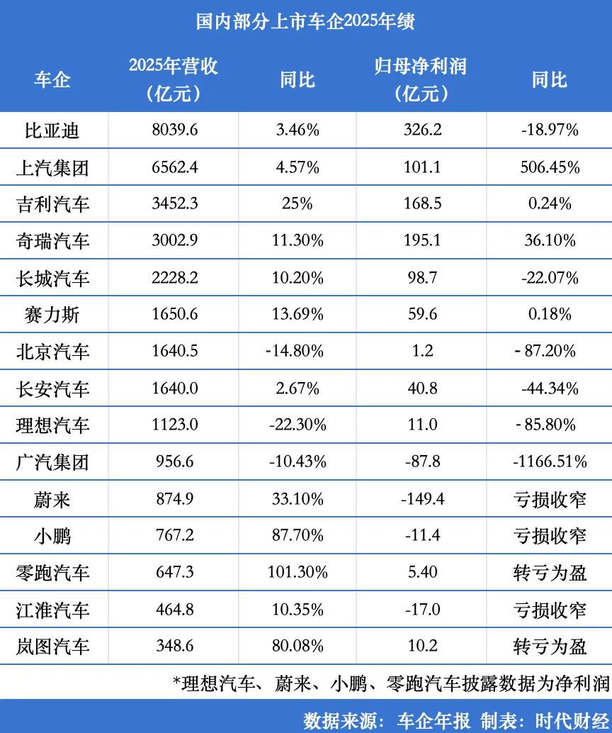 此外,2025年,广汽集团、理想汽车录得营收、利润双双下滑;蔚来、小鹏尽管实现单季盈利,但还未走出全年亏损。