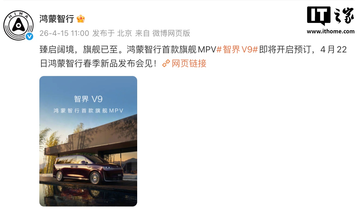 IT之家 4 月 15 日消息,4 月 15 日,智界汽车正式官宣智界 V9 将于 4 月 22 日开启预订。