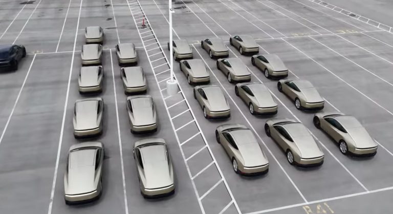 整个园区内可见约 50 辆 Cybercab,整齐密集地排成行列。大部分车辆仍保留方向盘和踏板,这是特斯拉为满足现行安全法规而加装的临时装置,以便在无方向盘设计获得全面监管批准前,积累真实道路数据。