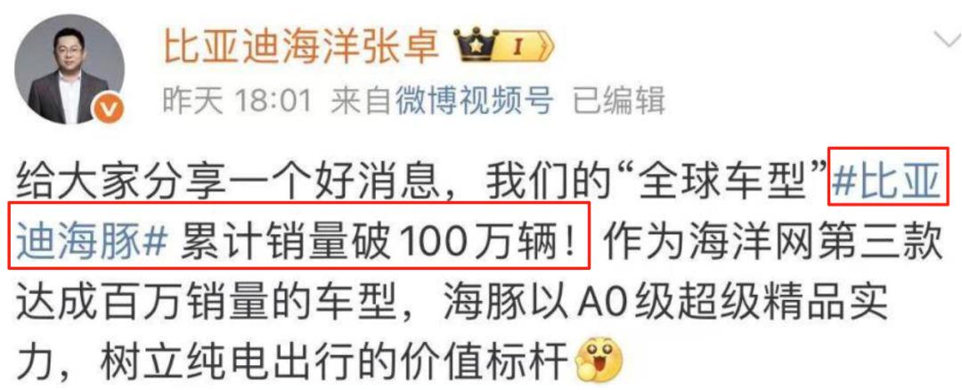 图/海豚销量破100万 来源/互联网 新能源观截图