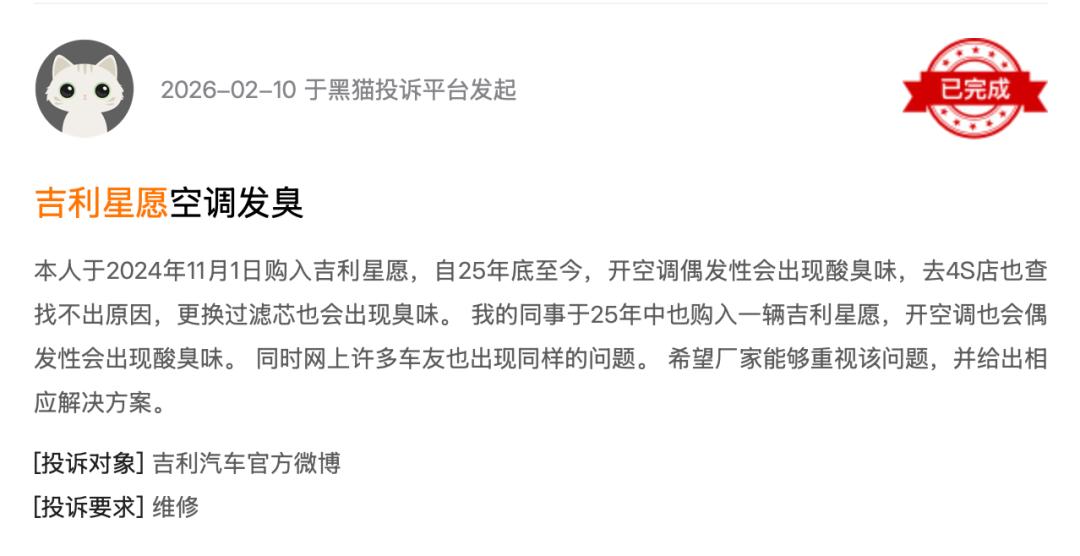 黑猫投诉平台上,一位在2024年购买了吉利星愿的消费者直言,自25年底至今,开空调偶发性会出现酸臭味,去4S店也查找不出原因,更换过滤芯也会出现臭味。