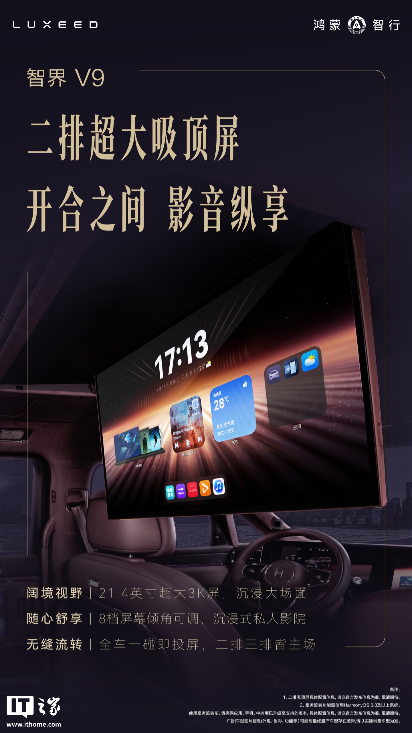 IT之家进一步对比官方此前的海报获悉,智界 V9 的二排吸顶屏同样采用了自由卡片桌面设计,桌面提供底部常驻 Dock 栏、桌面卡片、应用大文件夹等模块。具体到功能方面,后排娱乐屏预计还支持华为视频、华为音乐、天气查询、应用下载、个性化设置、手车互联、天气查看等。