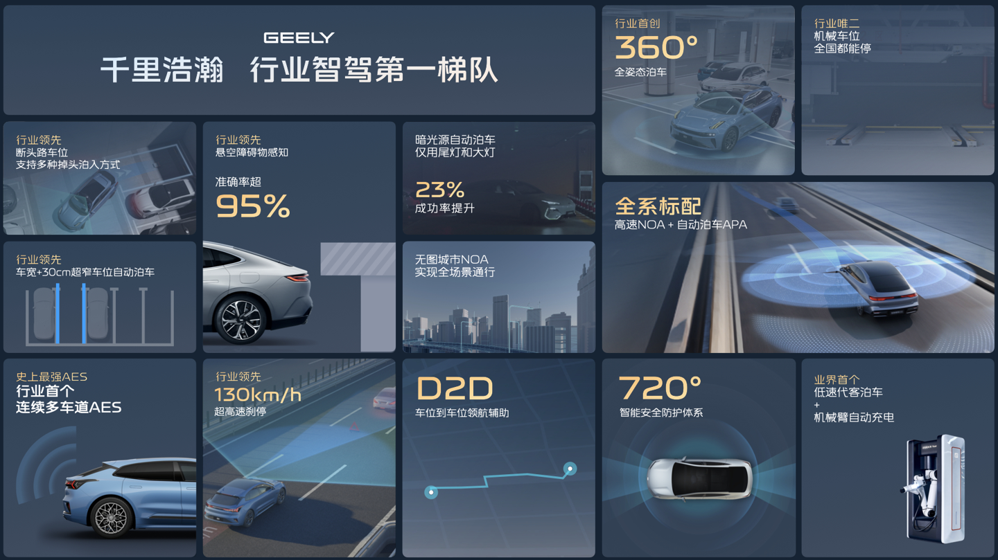 “千里浩瀚”安全高阶智能辅助驾驶系统于 2025 年 3 月发布。据IT之家此前报道,吉利方面当时宣布,吉利银河全新及改款产品都将搭载千里浩瀚不同层级的辅助驾驶方案,支持行业首创 360° 全姿态泊车、行业唯二机械车位全国都能停、无图城市 NOA 实现全场景通行、全系标配高速 NOA + 自动泊车 APA、悬空障碍物感知、超高速刹停 130km/h、业界首个低速代客泊车 + 机械臂自动充电等。