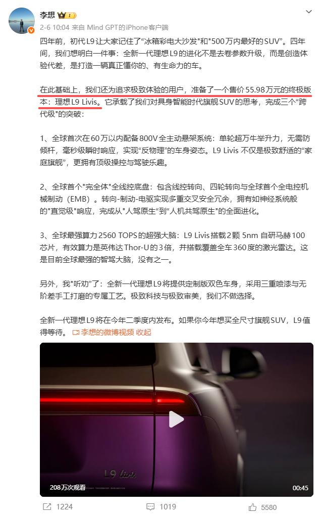 比如在今年 2 月份的时候,理想就公布了 L9 Livis,这台车售价 55.98 万,比老款 L9 的顶配还要高 12 万,你都可以叫它 L10 了。