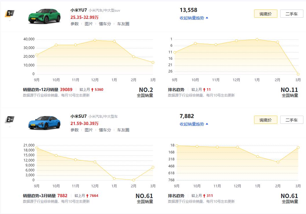 其实从销量数据来看,小米最近确实遇到点困难,就算不看 1、2 月年末对销量的影响,YU7 的销量排名也在大幅下滑,说明市场的地位确实下降了了。