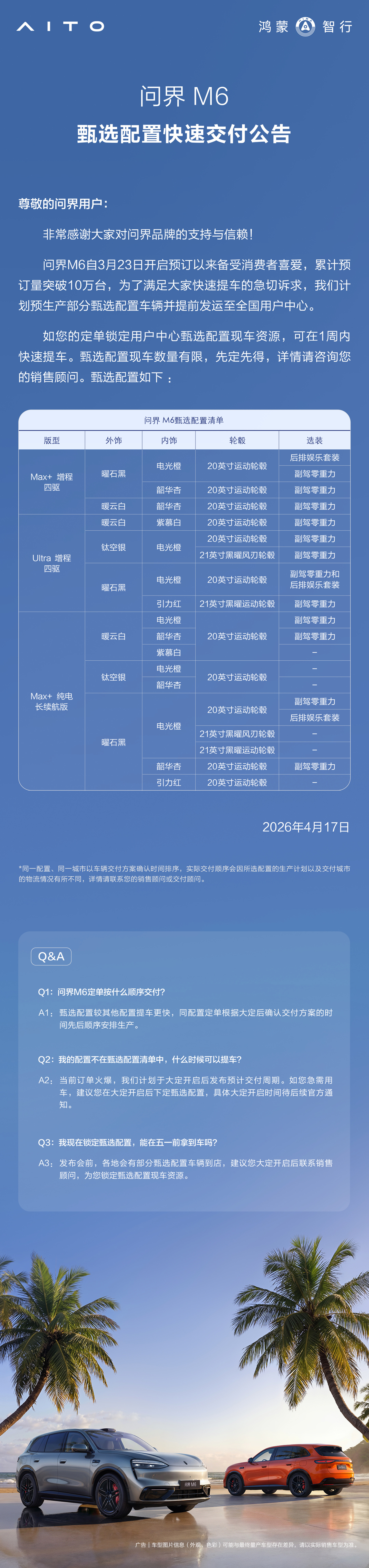 IT之家 4 月 17 日消息,鸿蒙智行今日官宣,问界 M6 车型预售订单突破 10 万,官方现推出甄选现车,提前发运全国门店。提前锁定甄选现车资源,最快可 1 周内提车。