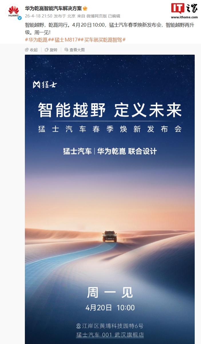 IT之家 4 月 19 日消息,华为乾崑智能汽车解决方案昨晚宣布,猛士汽车春季焕新发布会将在 4 月 20 日 10:00 举行,并喊出了“智能越野再升级”的口号。