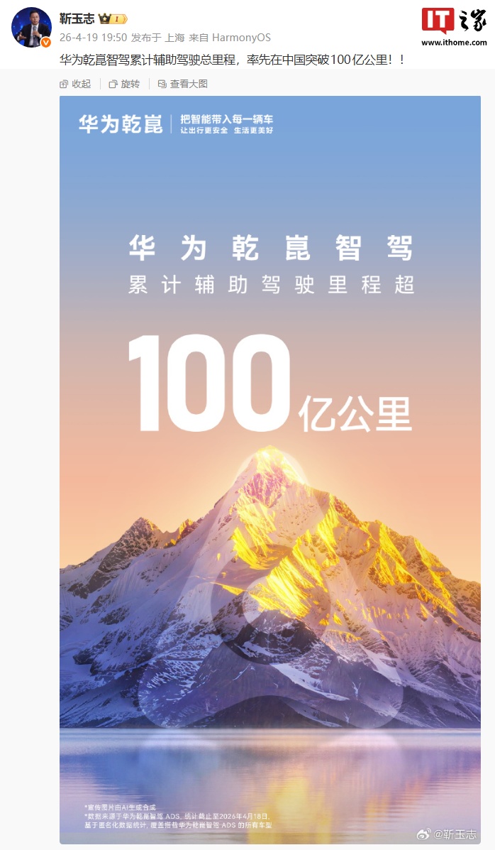 IT之家 4 月 19 日消息,华为智能汽车解决方案 BU CEO 靳玉志刚刚宣布:华为乾崑智驾累计辅助驾驶总里程,率先在中国突破 100 亿公里!