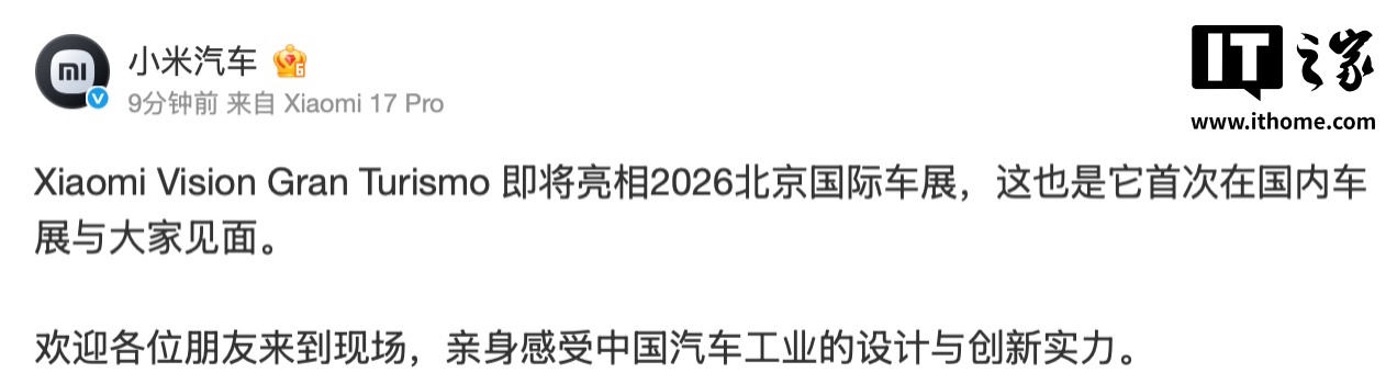 IT之家 4 月 21 日消息,小米汽车官方今日宣布,Xiaomi Vision Gran Turismo 即将亮相 2026 北京国际车展,这也是它首次在国内车展与大家见面。