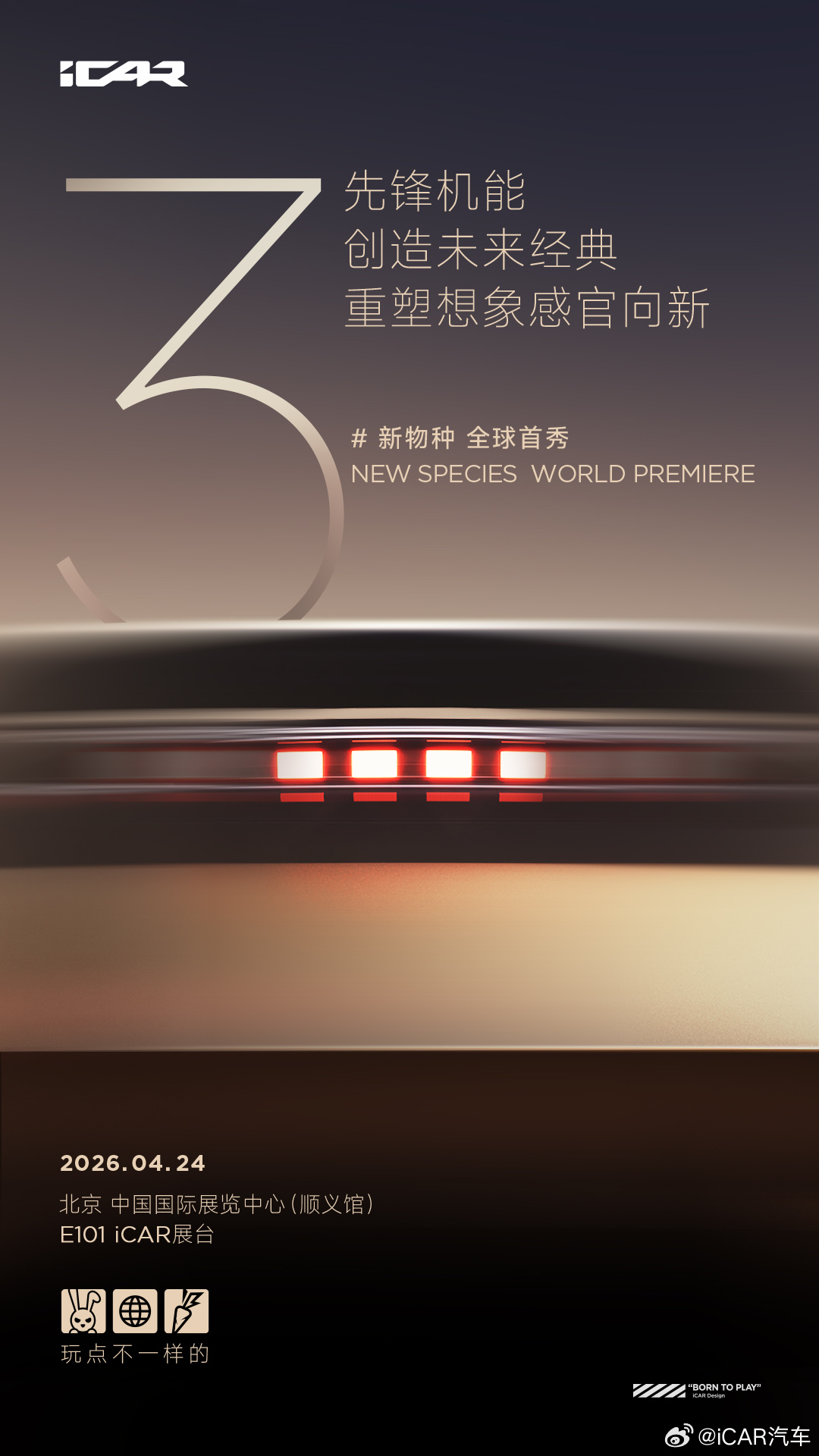 IT之家 4 月 21 日消息,奇瑞 iCAR 品牌官宣登陆北京车展,展台位于中国国际展览中心(顺义馆)E1 馆。据介绍,iCAR「新物种」届时将迎来全球首秀。