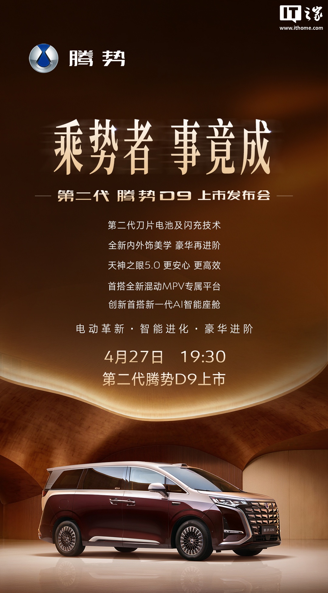 IT之家 4 月 22 日消息,比亚迪第二代腾势 D9 上市发布会今日官宣定档 4 月 27 日 19:30。