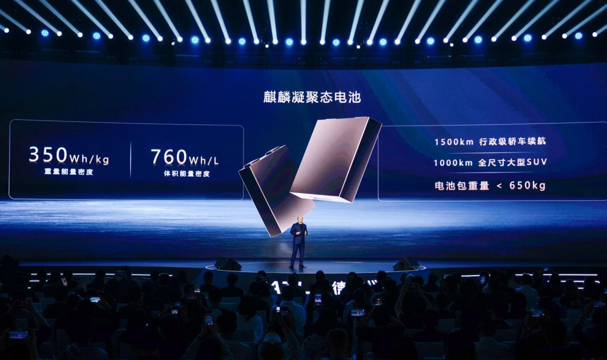 麒麟凝聚态电池电芯能量密度350Wh/kg,体积能量密度760Wh/L,为量产电池最高纪录。轿车续航可达1500公里,全尺寸SUV续航超1000公里,电池包重量控制在650公斤以内。该技术此前已在4吨级商用飞机完成首飞验证,即将在8吨以上商用飞机验证。电解质为凝聚态,实现“无液可漏、无液可燃”。