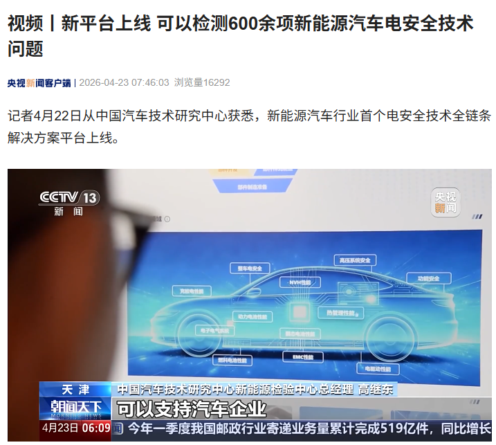 IT之家 4 月 23 日消息,据央视新闻报道,记者 4 月 22 日从中国汽车技术研究中心获悉,新能源汽车行业首个电安全技术全链条解决方案平台上线。