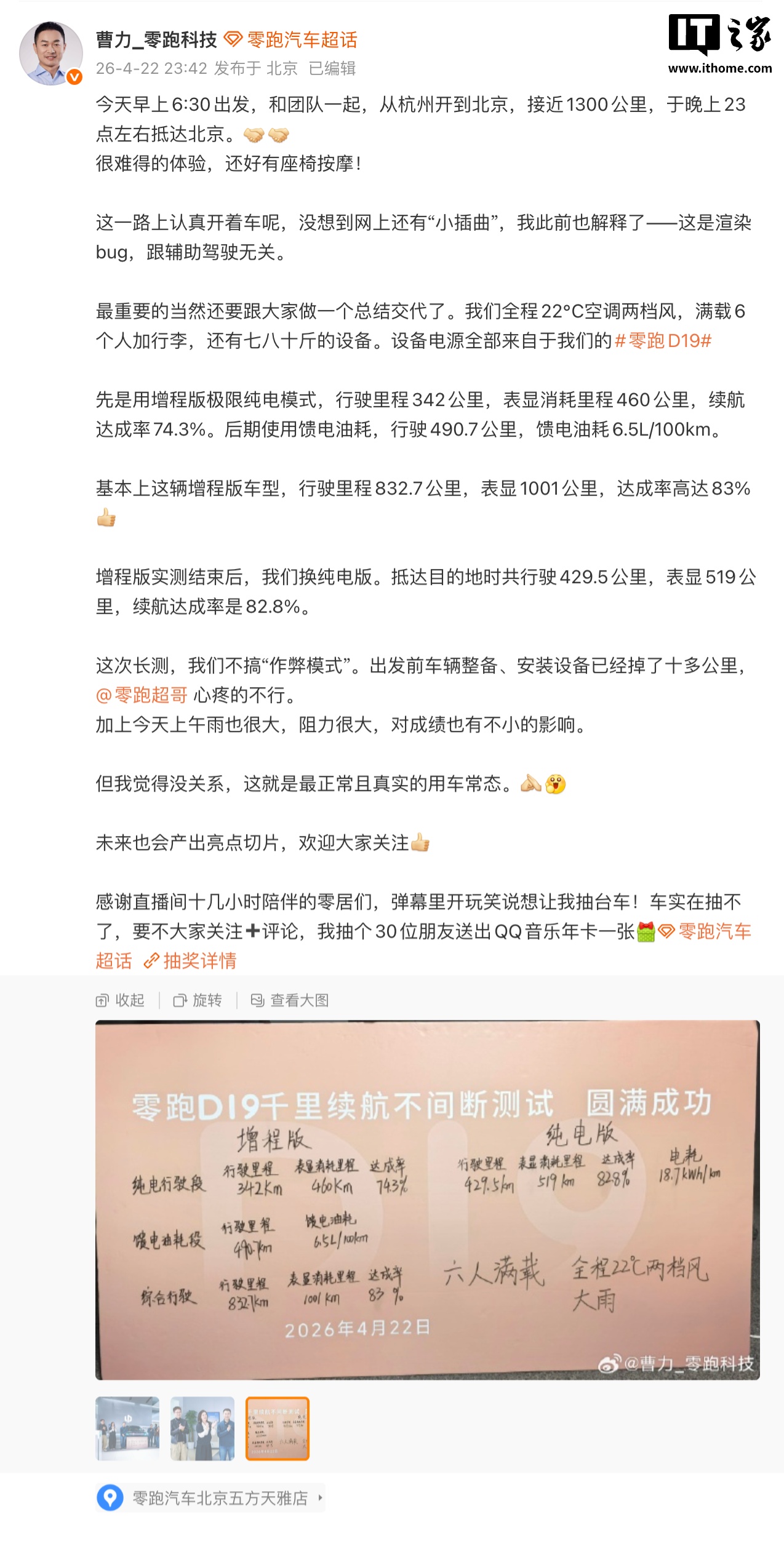IT之家 4 月 23 日消息,4 月 22 日(昨天)深夜,零跑科技高级副总裁曹力详细总结了当天从杭州开到北京的 D19 长测经历。
